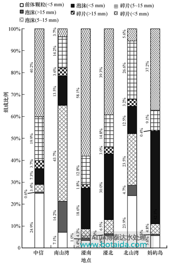 另外,不同尺寸級別的塑料垃圾數量比例也存在差異(圖 1).除南山灣和北山灣以外,其余4個沙灘中微型塑料總數所占比例都較高(高于70%),北山灣和南山灣的塑料垃圾中占比最大的尺寸主要集中在5~15 mm(占比均高于50%),且以泡沫為主.北山灣和中信北部沙灘上的中型塑料碎片(5~15 mm)比例較高,這些都可能成為該地區后期微型塑料污染的潛在來源.