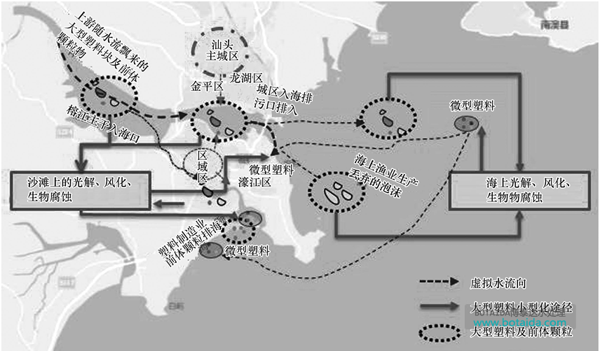 1)大型塑料和前體顆粒物的來源有:榕江上游隨水流飄入的部分,沿岸城區排放入海的部分,以及周圍塑料加工業排入環境中的前體顆粒.