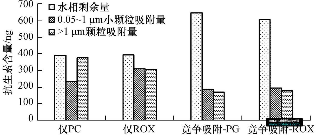 圖 6所示為青霉素G(PG)與羅紅霉素(ROX)單獨存在及共同存在于水中的吸附實驗結果.顆粒上的吸附總量有一定增加,增幅在所有6種競爭吸附中最小,這說明二者同時投加時相互抑制的現象比較明顯.具體到小顆粒的吸附能力及吸附量,二者降幅明顯且羅紅霉素降幅更大,競爭吸附平衡后二者吸附量相當.小顆粒吸附總量由309.20 ng上升至379.48 ng,漲幅為22.8%,依然存在吸附未達飽和的現象.結構上看,二者的活性基團不同,不會造成吸附位點的競爭,而且相互之間不發生復合反應,不影響抗生素本身的組成,但可能由于羅紅霉素分子量較大,占用空間較大,因此,產生了二者顆粒上的吸附量均減少但總量增多的結果.