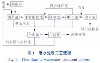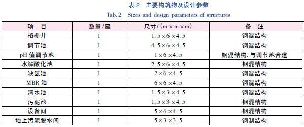 廢水先通過機械格柵除去較大的固體懸浮物。從格柵井流出廢水泵入調節(jié)池,以均勻水質,緩解水力沖擊負荷對后續(xù)工藝的影響。調節(jié)池出水進入水解酸化池,水解酸化池出水依次進入缺氧池和MBR 池,缺氧池的主要作用是進行反硝化脫氮,從而去除廢水中的氨氮。MBR 集膜的高效分離和生物降解于一體,是將污水生物處理技術與膜分離技術相結合的新型污水處理工藝。其用膜組件代替了傳統(tǒng)活性污泥工藝中的二沉池,可進行高效固液分離,達到水凈化的目的,克服了傳統(tǒng)工藝中出水水質欠穩(wěn)定、污泥易膨脹等不足。生物反應器內保持較高的污泥濃度,硝化能力強,污染物去除率高,部分混合液回流至缺氧池進行反硝化去除氨氮。MBR 池出水進入到清水池進行消毒后,出水可回用或達標排放。主要構筑物尺寸及設計參數(shù)見表2。