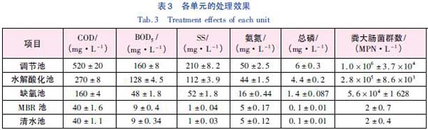 由表3 可見,系統(tǒng)對COD、BOD5、SS、氨氮、總磷、糞大腸菌群數(shù)的總去除率分別為92.3%、94.4%、99.5%、90.0%、98.3% 和100%,出水水質滿足《生物工程類制藥工業(yè)水污染物排放標準》(GB 21907—2008) 表2 規(guī)定濃度限值及《城市污水再生利用城市雜用水水質》(GB/T 18920—2002)標準。