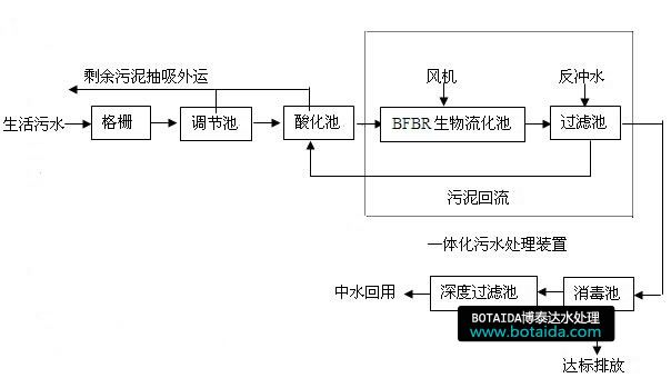 污水經格柵后進入調節池,進行水力水量調節,之后進入酸化池酸化(兼有沉淀作用),然后進入BFBR生物流化池進行生物降解及氧化處理,并經過濾池過濾,再經過加氯消毒,即可達標排放,若再經過深度過濾處理,即可作中水回用。