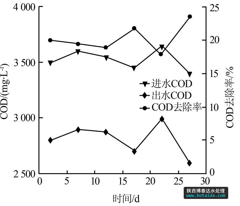 由圖 3可以看出,水解酸化工藝對COD的去除率基本穩定在20 %左右,與文獻〔6〕報道的10%~20%比較接近,出水COD約為2 800 mg/L。