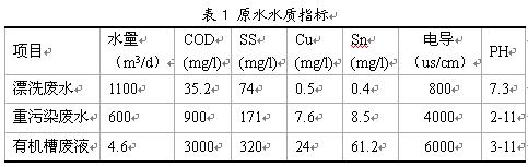 某電子公司是國內(nèi)重點(diǎn)集成電路封裝測試企業(yè),該公司主要從事半導(dǎo)體集成電路、半導(dǎo)體元器件的封裝測試業(yè)務(wù),其生產(chǎn)線廢水主要包括兩部分,一部分為晶元的減薄劃片廢水、另一部分為電鍍錫化廢水。減薄劃片廢水中主要含有大量的硅粉微粒,SS約2000mg/L左右,特性很穩(wěn)定,不易沉降,電導(dǎo)率僅為2-4µs/cm,東洋采用自主研發(fā)的二級連續(xù)UF膜系統(tǒng)進(jìn)行進(jìn)行廢水回收利用,廢水回收利用率≥90%,回收水質(zhì)好,同時(shí)回收硅粉。在此主要介紹電鍍錫化廢水的回用處理系統(tǒng);廢水中主要含有Cu、Sn、酸堿、有機(jī)物等,在該項(xiàng)目中首先要做好分質(zhì)分流是尤為重要,把錫化電鍍線上的廢水按照水中的成份及濃度來分質(zhì)收集,主要分為漂洗廢水、重污染廢水、有機(jī)槽廢液三路,水質(zhì)如下: