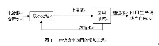 圖1是把所有電鍍廢水混合集中收集,先經(jīng)過物化或生物一系統(tǒng)處理,然后把上清液進(jìn)行膜系統(tǒng)回收,因在廢水處理過程中,投加了大量的PAC、PAM等,藥劑中含有大量的陽離子物質(zhì)存在水中,很容易與回用膜元件表面電荷結(jié)合而堵塞膜元件,更不能保證很高的回收率,通常回收率最高僅能達(dá)到50%,往往并不能保證長期穩(wěn)定的運(yùn)行;因投加了大量的藥劑,使廢水的含鹽量也大大的增加,所以也降低了回用水水質(zhì);通過膜技術(shù)回用后的濃縮水重金屬通常會超標(biāo),不能直接排放,這樣只能回到廢水前處理系統(tǒng)中,從而增加了廢水處理部分的負(fù)荷及水量,嚴(yán)重影響廢水處理部分的效果,同時(shí)占地及土建投資也增大。