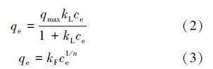 其中,qe為吸附平衡吸附量(mg · g-1),qmax為吸附劑飽和吸附量(mg · g-1),ce為平衡時溶液中剩余磷濃度(mg · L-1),kL為與熱力學有關的常數(L · mg-1),kF為與吸附強度有關的常數(L · g-1),n為與吸附能力有關的常數.