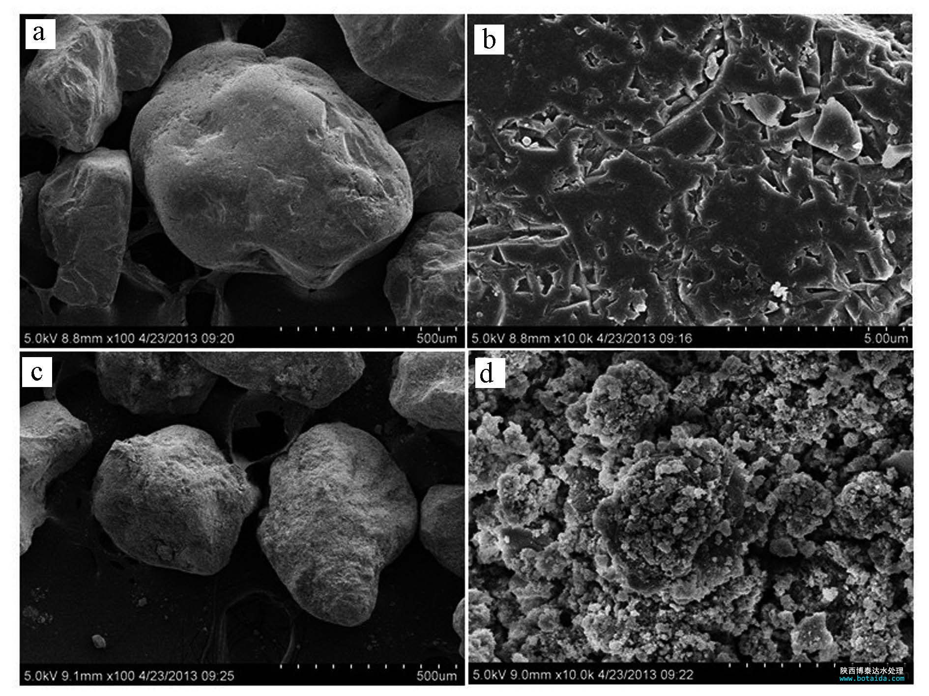 圖1 海砂與包覆海砂的掃描電鏡照片(a. 海砂×100倍; b. 海砂×10000倍; c. 包覆海砂×100倍; d. 包覆海砂×10000倍)