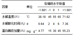 根據CCD(Central Composite Designs)中心組合試驗設計原理,在前期單因素試驗的基礎上,選擇水解溫度、水解酸化時間和蛋白酶投加量作為自變量,分別用X1、X2、X3表示,以總VFA濃度和SCOD濃度作為響應值,分別用Y1、Y2表示,進行響應面試驗因素水平安排,具體見表 1.由Design Expert 8.0.6(Stat-Ease),采用CCD試驗設計原理,得到3因素3水平共20個試驗點的試驗方案,并對試驗數據進行二次多元回歸擬合.二次多元回歸方程為: