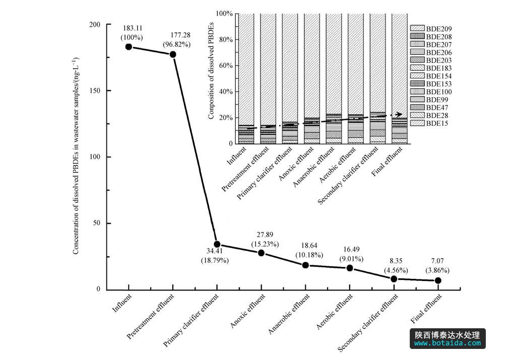 圖2 污水處理流程中溶解態PBDEs濃度和百分比組成變化