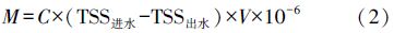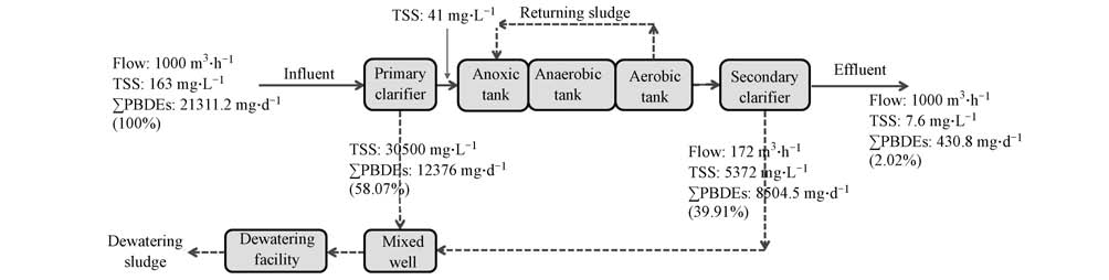 式中,M是各構筑物污水或污泥的PBDEs日均負荷量(mg · d-1);C是各構筑物污水或污泥中PBDEs的濃度(ng · L-1,ng · g-1);V是污水的日均流量(m3 · d-1);TSS是污水中總懸浮顆粒物濃度(mg · L-1).