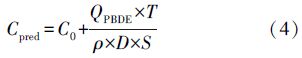 該污水廠的負荷計算結果如圖 4所示.從圖 4可以看出,該污水廠的日均PBDEs負荷量為21311.2 mg · d-1或者1.83 g · wt-1,污水經初沉池和二沉池處理之后分別有58.07%和39.91%的PBDEs被去除,即一共有97.98%的PBDEs被去除了,最后在出水中只剩2.02%的PBDEs.雖然最后只有2%的PBDEs經出水排放到接納河流中,但是這個排放的負荷量還是相當大的,尤其是那些規模大的污水廠,其排放的負荷量就更大了.就我們研究的污水廠來說,其通過出水的日均排放PBDEs的量高達430.8 mg,也就是說每天有430.8 mg的PBDEs排放到接納河流,對該河流的飲水供應和水產品造成了潛在的威脅(Rayne and Ikonomou, 2005).另外一方面,初沉池和二沉池的污泥農用可能造成更大的負面影響,因為污泥中PBDEs的含量更高.就我們研究的污水廠來說,其通過脫水污泥日均排放PBDEs的量高達20880.4 mg.同樣的,這些PBDEs通過污泥農用被釋放到農用土壤中,造成一定的潛在威脅,因此需要對污泥農用之后的土壤中PBDEs濃度增加量進行估算.估算公式如下: