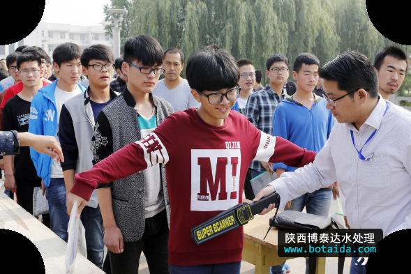 “最嚴高考年”不僅僅是針對考試中的作弊處罰,高考生進場要安檢,將有金屬探測儀“上陣檢測”。戴眼鏡的考生要取下眼鏡,耳朵、腋下、手腕處、腰部、皮帶扣內側、衣袋、鞋襪內等等都是檢查重點。圖為2016年6月7日,在江蘇連云港市贛榆高級中學考點,監考老師對入場的考生進行檢查。思維/視覺中國