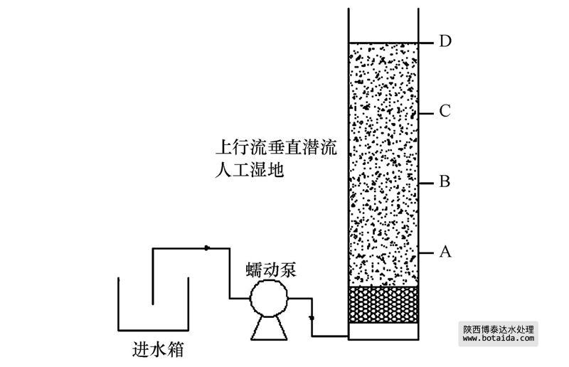 試驗裝置模擬上行流垂直潛流人工濕地,裝置直徑15 cm,高100 cm,填料層高度80 cm,底部填充10 cm厚的礫石為布水區(圖 1).填料柱采用蠕動泵進水,進水以松花江富錦段微污染江水水質為依據配水,水質為COD 80~100 mg · L-1,NH+4-N 10~13 mg · L-1,NO-3-N 13~15 mg · L-1,TP 1.5~2.5 mg · L-1.水力負荷為2.65 mL · min-1,運行時間為20周.系統穩定運行后,對填料層的不同深度進行分析,考察不同填料段污染物在濕地中去除的規律,在填料20、40、60、80 cm處分別設置取樣口,編號分別為A(0~20 cm)、B(20~40 cm)、C(40~60 cm)、D(60~80 cm).