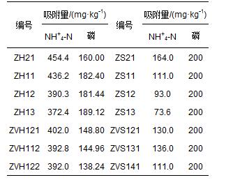 根據上述實驗結果,綜合考慮各填料吸附能力及其性質的差異,進行不同填料組合方式的優化配比.不同填料組合方式對氮、磷48 h的吸附量如表 5所示.由表可知,不同填料組合方式對NH+4-N的吸附效果不同.對NH+4-N吸附效果最好的為沸石與空心磚的ZH組合,沸石、空心磚與火山巖的ZVH組合次之,7種填料組合方式的吸附量均在370 mg · kg-1以上,最高吸附量達到了454.4 mg · kg-1.7種填料組合方式對NH+4-N去除效果的排序為ZH21 > ZH11> ZVH121> ZVH112 > ZVH122> ZH12> ZH13.通過對各填料組分干容重及在填料組合中所占比例的計算可知,在不同填料組合方式中,沸石含量較高的填料組合方式對NH+4-N的吸附量較高.填料中含有鋼渣的ZS與ZVS的組合方式對NH+4-N的吸附效果較差,吸附量遠低于無鋼渣組合,均在170 mg · kg-1以下.由此可知,鋼渣的存在對沸石吸附NH+4-N產生了一定的抑制作用,這可能是由于鋼渣的特性導致的.