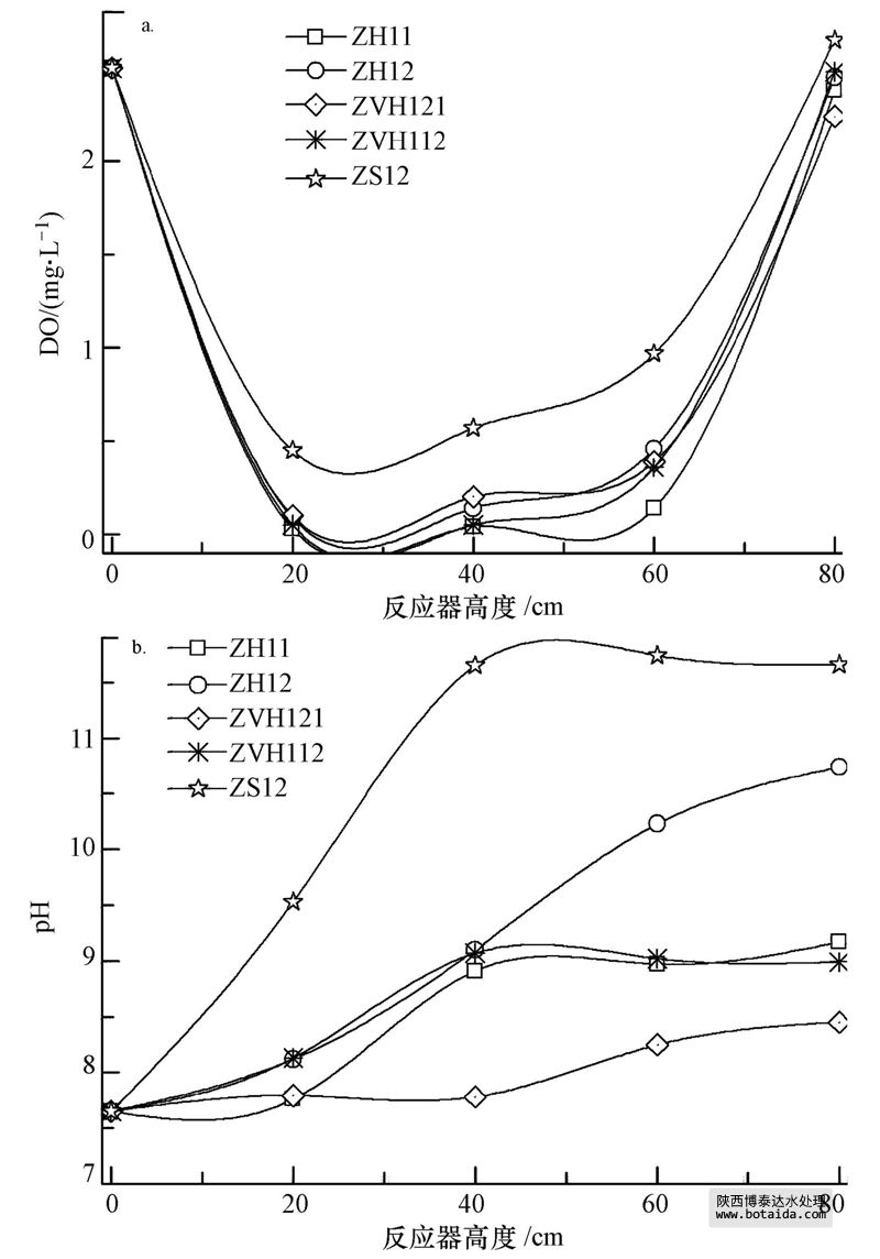 運行穩定后,反應器中不同填料段DO與pH的變化如圖 2所示.DO在各反應器分布趨勢基本相似,在各段的數值上存在差異.DO在不同填料段的濃度具有明顯的空間特征,導致反應器在不同段形成了厭氧、缺氧、好氧交替的環境,這對微生物的生物降解、硝化、反硝化作用具有較大的影響.在各反應器底部20 cm處DO濃度均在0.5 mg · L-1以下,ZH11、ZH12、ZVH112、ZVH121的填料組合方式中,底部DO濃度達到了0.2mg · L-1以下.這說明當污水進入反應器后,DO被迅速消耗,在各反應器0~40 cm間形成了一個厭氧環境.同時隨著反應器高度的增加,反應器中DO濃度有所升高,在反應器頂端接觸空氣處達到最大值,各反應器頂部80 cm處的DO濃度維持在2.24~2.65 mg · L-1之間,這是由于大氣復氧導致DO濃度的升高.同時,由于該處污水可生化性已經較差,污染物不再耗氧分解.