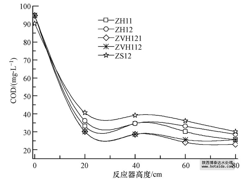 圖 5為NO-3-N在反應器豎直方向上分布情況,NO-3-N在反應器0~40 cm處得到大部分的去除,40~80 cm處去除量較少.這是因為0~40 cm間較低的DO為微生物反硝化提供了一個良好的厭氧環境,同時COD在此段的大量降解為微生物反硝化提供了電子,致使反硝化菌在此段活性較高,反硝化作用較強.