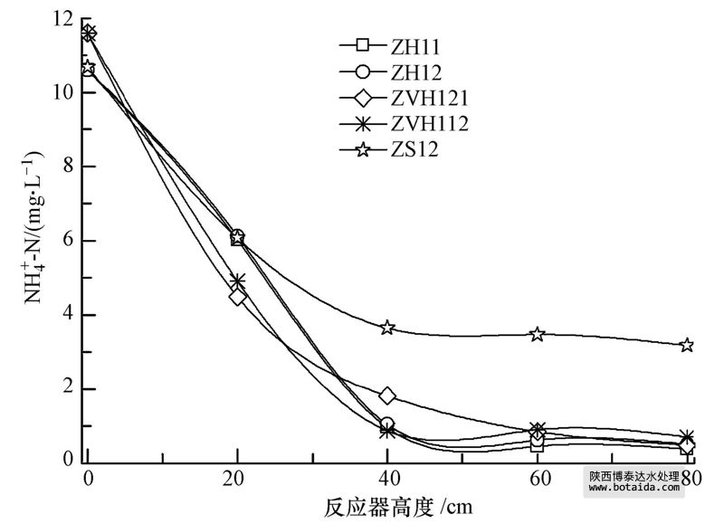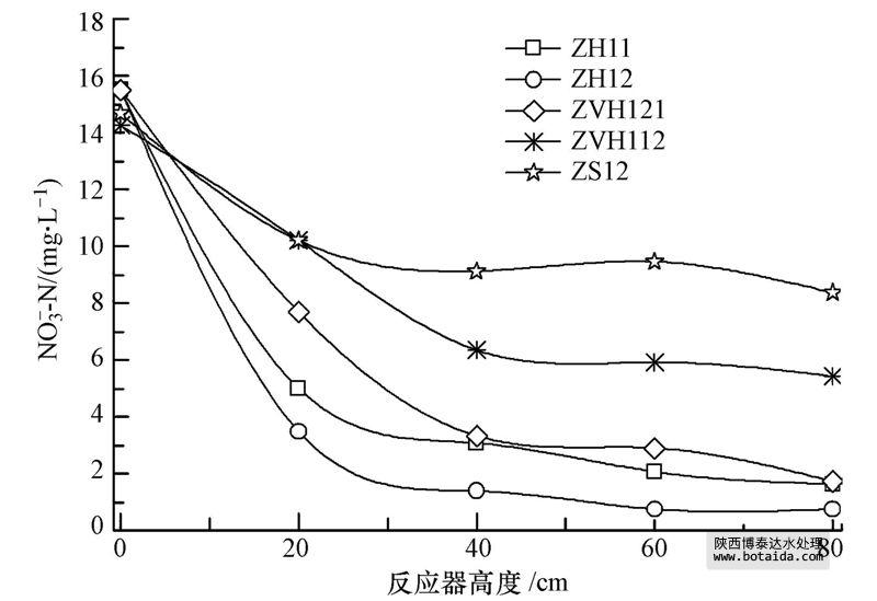 反應器中NH+4-N的去除有兩種途徑:第一,通過反應器中填料的吸附去除;第二,通過微生物的同化、硝化等作用被微生物自身利用或轉化為NO-3-N和NO-2-N(Ahn,2006).人工濕地運行前期NH+4-N主要通過填料吸附,但通過一段時間的運行后,微生物起到了主要去除NH+4-N的作用.圖 4展示了NH+4-N在反應器豎直方向上的變化,除含鋼渣的填料組合外,其它組合變化規律相似,在0~40 cm去除NH+4-N較多,說明各反應器在此段的生物量較為豐富,除基質吸附的部分外,一部分的NH+4-N通過微生物作用得到去除.而含鋼渣的ZS12組合由于pH在40 cm迅速的升高,不僅對微生物產生巨大影響,并且導致溶液中平衡NH+4+OH-NH3·H2O向右移動,填料對NH+4-N的吸附效果降低,影響NH+4-N的總體去除效果.武俊梅等(2010)對多種填料進行了實驗,發現沸石對NH+4-N的去除效果顯著高于其它填料,而鋼渣會使溶液pH上升,對NH+4-N去除效果較差.含有空心磚的組合由于pH沿反應器豎直方向上升的較為緩慢,大部分的NH+4-N在反應器底部已經得到有效的去除,pH在反應器頂部的升高并不會影響NH+4-N的出水濃度.