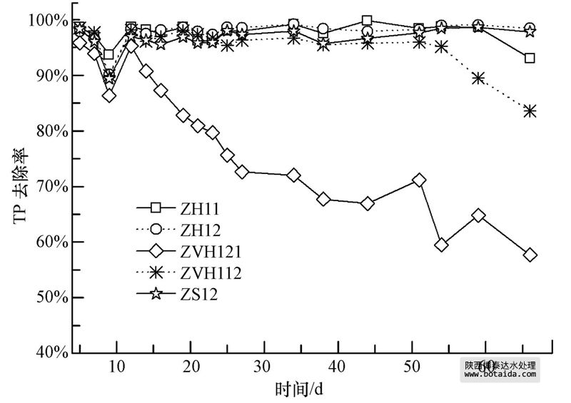 圖 6展示了反應器運行前70 d,各反應器中TP去除率的情況.ZH12、ZH11、ZS12填料組合對磷一直保持著較高的去除率,而ZVH121、ZVH112填料組合在運行期間磷去除率的降低,是因為在該組合中空心磚含量較少,在反應器運行一段時間后,反應器中的空心磚對磷吸附達到飽和.含鋼渣的ZS12組合對磷的去除效果穩定且較高,但相比較于其他污染物的去除,鋼渣并不適于在人工濕地處理含磷較低廢水的工程中應用.而空心磚不僅能有效地去除磷,且對氮的去除無明顯負作用,適合添加到填料組合中,在不影響其它污染物去除效果的同時,用于提高人工濕地中磷的去除效果.
