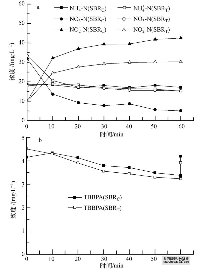 本研究采用實驗室序批式活性污泥反應器(sequencing batch reactor activated sludge process,SBR),研究TBBPA在工藝中的去除,尤其關注其在SBR典型周期內的變化特征,以及TBBPA在硝化反硝化過程中的去除特性和相關機理.