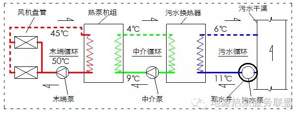 為應對污水或地表水水質條件,目前的系統多采用間接式系統。先將污水或地表水的熱量傳遞給清潔水,再由清潔水進入熱泵機組,清潔水在污水換熱器和熱泵機組之間形成封閉循環,起中介熱量傳遞作用,我們將其稱之為“中介循環”,而污水或地表水的自身循環稱之為“污水或地表水循環”,末端系統循環水在熱泵機組與末端散熱設備之間循環則稱之為“末端循環”。