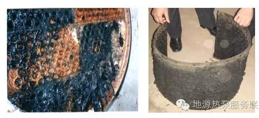 (1)防堵塞。未處理原生污水中含有大尺度懸浮物,包括纖維狀的發絲類、紙屑類、藻狀類,普通的換熱設備是根本無法承受的。而實踐證明:已處理污水和地表水中的懸浮物含量相對較少,盡管與未處理原水不在同一數量級,但隨著運行時間增長,堵塞問題也立即突現,原水的堵塞時間為1~3d,而地表水則為7~10d。圖4是未處理原生污水的堵塞現象,圖5是已處理污水的堵塞狀況。