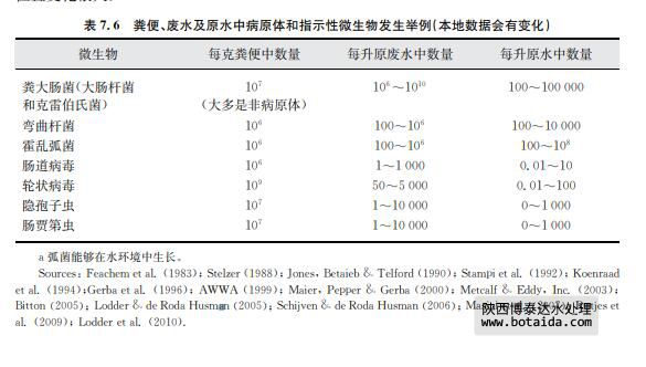 表7.6中,可以清楚地看到糞便指示菌,如大腸桿菌在廢水中常常呈現(xiàn)較高濃度。每個(gè) 人都會(huì)散布大腸桿菌,但濃度變化很大。只有被感染的人散布病原體,因此,廢水中病原體 濃度變化更大。這樣的變化取決于擴(kuò)散模式,也依賴于其他因素,如排放廢水的人群規(guī)?;?被其他廢水、如工業(yè)廢水稀釋的規(guī)模。傳統(tǒng)廢水處理在廢水被排放到地表水之前,常常降低 一到兩個(gè)數(shù)量級(jí)的微生物濃度。在其他地方,原水被直接排放,或者通過排水管溢流偶爾排 放。排放廢水被受納水體稀釋,從而減少了病原體數(shù)量,稀釋因子是因地而異。病原體失 活、死亡或進(jìn)入到沉積物里也會(huì)使病原體減少。這些因子隨著表面水體和氣候的不同而變 化。這種變化說明糞便指示菌和病原體的濃度在地表水體比廢水中變化更多。
