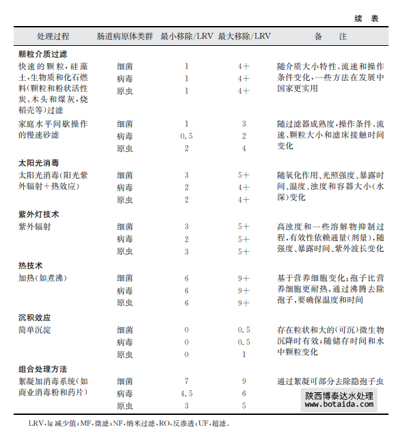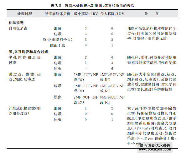 表7.8總結了采用上述幾種家庭水處理技術對水傳播細菌、病毒和寄生性原生蟲的 去除情況。這些去除信息是基于科學文獻報告的研究結果。有兩個有效性內容:基本去 除和最大去除。基本去除是指由相對不熟練人員實際操作時的一般運行效果,且操作人 員將以上方法用于處理平均水質或可變水質原水及現(xiàn)場只有很少應用工具以優(yōu)化處理條 件和操作時。最大去除是指在熟練操作和優(yōu)化運行條件下,并且在可預見和不變水質條 件下,有相關儀器工具支持并保持最高水平運行時達到的效果(如測試一個已知濃度和種 屬的微生物時)。應當該注意的是某些水處理工藝的lg減少值存在差異,如表7.8中的 家庭水處理和表7.7中的集中處理。這種相同處理技術、不同的運行效果差異是可以理 解的。因為集中處理所用水通常滿足處理工藝所需要的質量,而且處理過程由訓練有素的操作人員使用,工藝經(jīng)過合理的設計并有良好的運行控制系統(tǒng)。相反,家庭水處理通常 水質變化較大,也沒有得到最好的運行技術優(yōu)化。相對于管理集中處理設施的人員,處理 過程也常常得不到專業(yè)人員的專業(yè)運行控制。這些處理過程的進一步細節(jié),包括運行影 響因子和表7.8中提供的lg減少值水平基礎,可見附錄1支持性文件《家庭水管理和家庭 水處理選擇評估》。陜西博泰達水處理為您提供服務。