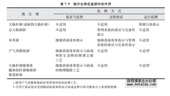 這些標準表明一種設想,同一種生物可以被同時用作糞便污染的指示生物,也可以用作 指示處理效率。但是很清楚的是,一種指示生物不能發揮這兩種功能,針對不同的目標,應 該考慮不同的生物(見表7.9)。例如,異養菌可以作為消毒效率和管網系統清潔的運行指 示,而產氣莢膜梭菌和大腸桿菌噬菌體可以用來驗證處理系統的效率。
