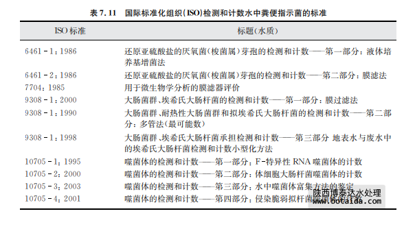 國際標準方法在被采納之前應根據當地的具體情況進行評估??梢允褂靡呀⒌臉藴?方法,如國際標準化組織(ISO)(見表7.11)的方法或效果及可靠性與其相當的方法均可采 用。對于常規檢測可采用那些已建立的方法。無論選用何種方法檢測埃希氏大腸桿菌或耐 熱性大腸菌群,都必須考慮因環境或消毒劑受到損傷的微生物菌株的“復蘇”或“恢復”問題。