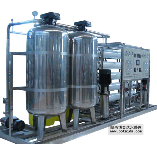原水→原水加壓泵→多介質過濾器→活性炭過濾器→軟水器→精密過濾器→第一級反滲透 →PH調節→中間水箱→第二級反滲透(反滲透膜表面帶正電荷)→純化水箱→純水泵→微孔過濾器→用水點