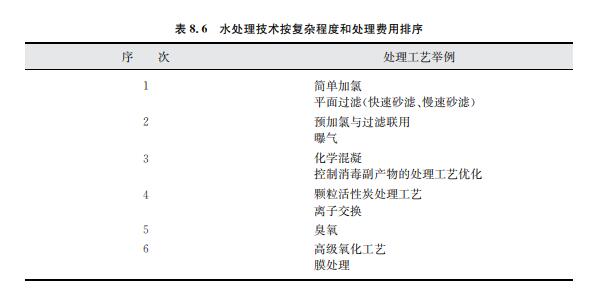 不同水處理工藝按其復(fù)雜程度和處理費用的定性排序如表8.6所示,次序越高,工藝或 運營越復(fù)雜。同時,通常來說也意味著更高的處理費用。