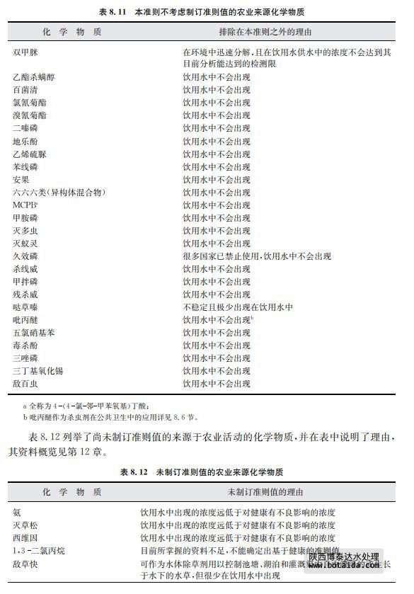 由于一些關(guān)于飲用水中存在化學(xué)物質(zhì)以及其穩(wěn)定性的文獻(xiàn)有明顯證據(jù)指出某些農(nóng)業(yè) 來源的化學(xué)物質(zhì)不會出現(xiàn)在飲用水中,對于此類化學(xué)物質(zhì)本準(zhǔn)則不考慮建立準(zhǔn)則值(見表 8.11)。