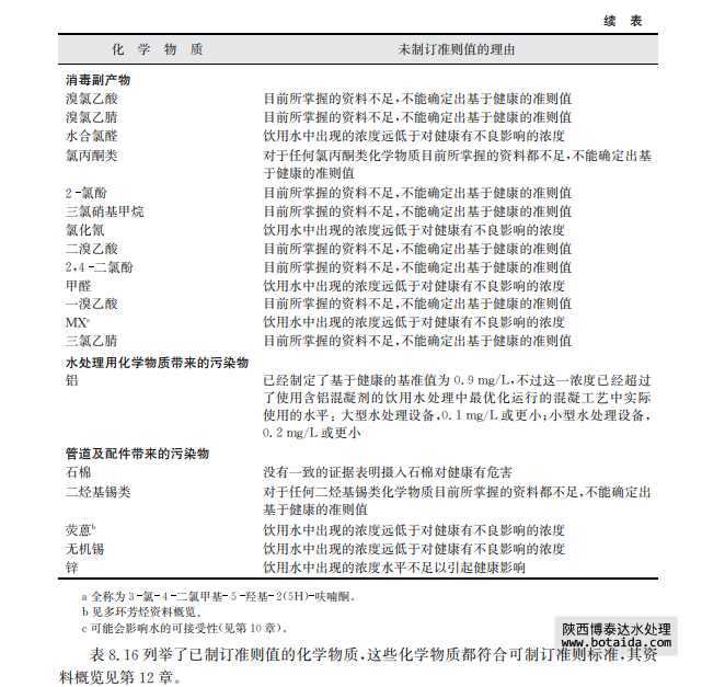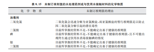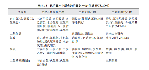 在水處理過程中,有些物質(zhì)是人為添加進(jìn)入水體的(直接添加物),有些物質(zhì)可能不受控 制地殘留在出水中(如鹽類、高分子絮凝劑殘留物或單體)。類似氯胺或自由氯的殘留屬于 有意添加,這些殘留對水質(zhì)保障有一定好處。其他物質(zhì),如消毒副產(chǎn)物,是在消毒劑與水中 通常存在的一些物質(zhì)相互起化學(xué)反應(yīng)過程中產(chǎn)生的(見表8.14)。氯化消毒副產(chǎn)物和其他消 毒副產(chǎn)物也可能會(huì)在游泳池用水中出現(xiàn),此時(shí)吸入和皮膚吸收途徑對人體接觸消毒副產(chǎn)物 更加重要(WHO,2006)。