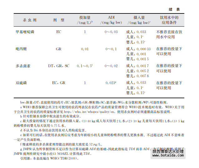 雖然沒必要為以控制攜菌體為目的的農藥設定準則值,但有必要就它們使用時的安全 性提供足夠的信息。用于飲用水攜菌體控制的農藥劑型必須嚴格遵守商品標簽建議,并且 包括從材料到配制最終產品的配方組分,一定要使用國家主管部門批準可用于此用途的產 品。為制定準則評估控制攜菌體的農藥時,評價報告主要由犃犇犐與潛在暴露風險的比較組 成。不過,超過犃犇犐的攝入不一定意味著會對健康產生負面影響。由于攜菌體傳播的疾病 有很高的發病率和死亡率,控制病原昆蟲與飲用水攝入農藥量之間必須找到一個合適的平 衡。需要強調的是,應努力使總攝入量和任何殺幼蟲劑的濃度都低于 WHOPES的推薦水 平,并且在具有足夠的效力條件下盡可能低。
