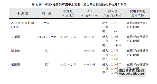 各成員國應考慮將殺幼蟲劑的使用規范劃入寬泛的攜菌生物控制策略中。殺幼蟲劑的 使用僅可作為家用貯水設備綜合性管理計劃的一部分,且生活垃圾管理不應該僅僅依靠殺 蟲劑殺滅幼蟲,應該包括其他一些環境管理措施和社會行為規范。不過,一些關于現場條件 暴露量的實際數據對于此類化學物質暴露量邊界的更準確評估可能有重要意義。