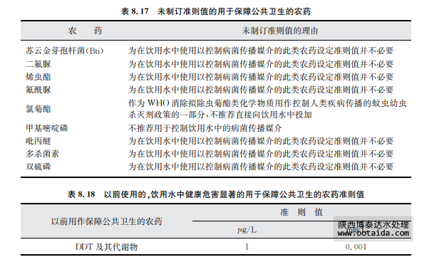 表8.17列舉了尚未制訂準則值用于保障公共衛生的農藥。二氯二苯基三氯乙烷 (DDT)在過去常被使用以保障公共衛生,現在在某些地區將DDT再次引入以控制攜帶瘧疾 的蚊蟲(但不應用在飲用水領域)。表8.18列出了DDT的準則值。表8.19列舉了各種殺 蟲劑產品的劑型,投量比和相應的攝入量。 準則中所涉及的殺幼蟲劑的資料概覽詳見第12章