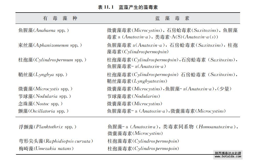如表11.1所示,許多藍藻能產生強毒素。在8.5.1.節中也談到藍藻毒素。每種毒素都 有其特性,涉及肝損害、神經毒性和促癌作用。報道的急性中毒癥狀有胃腸功能紊亂、發熱 和皮膚、耳、眼、咽喉、呼吸道刺激。藍藻在人體內不能增殖,因此沒有感染性。