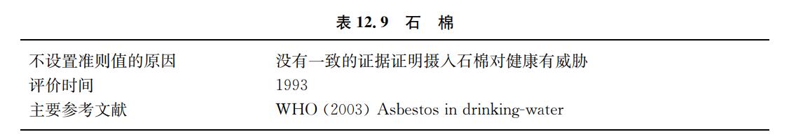 水中的石棉來自含石棉的材料和礦石在水中的分解,也來自工業排放物以及大氣污染 和供水系統中的石棉 水泥管道。石棉纖維從石棉 水泥管剝落可對水的供應造成威脅。有 限的資料顯示,在淋浴或空氣潮濕時,從自來水釋放到大氣的石棉暴露量可以忽略不計(見 表12.9)。