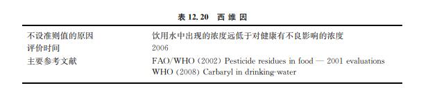 西維因通過抑制腦膽堿酯酶活性發(fā)揮作用,這也是其主要的毒性模式。不過,西維因也 被認(rèn)為是一種小鼠體內(nèi)會引起雄性小鼠血管瘤的非基因毒性致癌物。在此基礎(chǔ)上,JMPR 設(shè)定犃犇犐為0~0.008mg/kgbw,這一犃犇犐通過15mg/kgbw/d的最低損害作用水平 (LOAEL)以及采用安全系數(shù)為2000(種間變異為10,種內(nèi)變異為10,不確定系數(shù)另取10 用來反映罕見惡性腫瘤的出現(xiàn))計(jì)算而得。 假定一個60kg的成年人每天飲用2L水,飲用水的攝入配額假設(shè)為20%,從0~ 0.008mg/kgbw的犃犇犐值可以確定以健康為基準(zhǔn)的準(zhǔn)則值為50μg/L(取整值)。不過,似 乎在飲用水中沒有發(fā)現(xiàn)高濃度西維因,因此認(rèn)為沒有必要提出一個正式的準(zhǔn)則值。