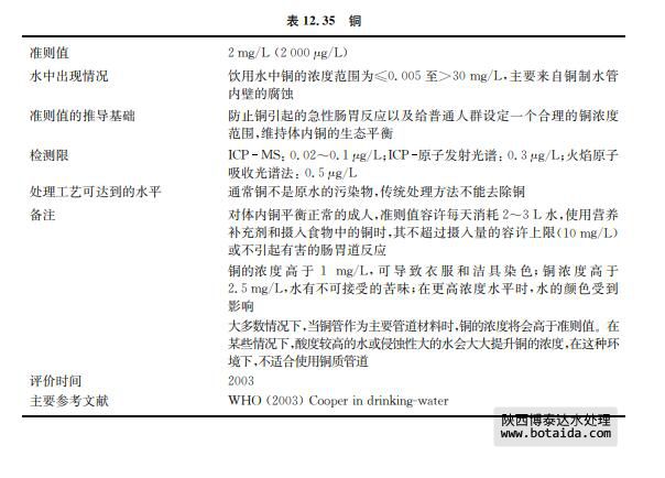 銅既是基本營養元素,又是飲用水的污染物(見表12.35)。銅可用于制造管件、閥門和 配件,還可用于合成合金和鍍層。五水硫酸銅化合物有時會用于地表水中的藻類控制。飲 用水中銅的濃度范圍很廣。大多數情況,其主要來自銅制水管內部的腐蝕。不過不斷流動 的水或有壓流的水中銅的濃度往往較低。反之,在靜止的水或部分流動水中銅的濃度變化 很大,最高濃度較高(經常高于1mg/L)。在水輸送過程中,特別是輸水系統中處理過的水 呈酸性或含高濃度碳酸鹽而呈堿性的水中,往往會使銅的溶解增加,濃度升高。發達國家中, 食物和水是銅的主要暴露源。在使用裝有銅水管或接頭的管網系統中,水流經常靜止或部分 流動條件下,可以大大增加每日銅的攝入量,特別是嬰兒人工喂奶時用自來水調配的奶。
