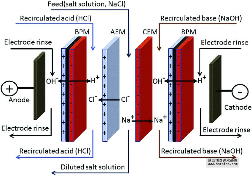 高鹽廢水的處理問(wèn)題,越來(lái)越成為必須解決的環(huán)境難題,嚴(yán)重制約著石油化工、生物制藥、食品發(fā)酵、催化劑合成、碳纖維生產(chǎn)等工業(yè)生產(chǎn)。高鹽廢水難以生化降解,反滲透膜法通常只能濃縮到鹽濃度5~8%,而采取熱法蒸發(fā)成本較高,因此,當(dāng)前尚缺乏經(jīng)濟(jì)可行的高鹽廢水處理辦法。大量高鹽廢水的排放可能造成沙漠、土壤、地下水污染嚴(yán)重。雙極膜電滲析技術(shù)可以實(shí)現(xiàn)鹽水的直接分解成酸堿實(shí)現(xiàn)資源化回用,投資成本僅僅為熱法的30%,運(yùn)行成本僅為熱法的10%,是一種經(jīng)濟(jì)可行,易于操作維護(hù),安全可靠的濃鹽處理技術(shù),對(duì)真正實(shí)現(xiàn)零排放有著重要意義。