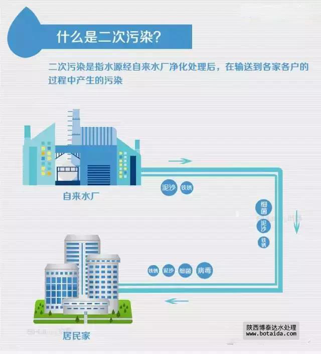 顧名思義,二次污染是指水源經自來水廠凈化處理后,在輸送到各家各戶的過程中產生的污染。主要是一些水管老化出現的鐵銹、泥沙、細菌、病毒等雜質和自來水廠氯制劑消毒后的副產物。二次污染的污染源主要有自來水管道、小區二次供水系統和水龍頭。