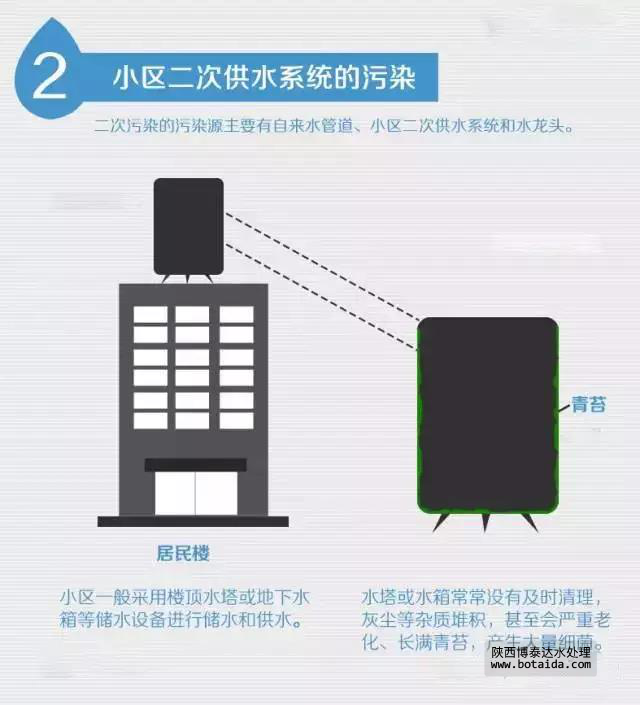 小區一般采用樓頂水塔或地下水箱等儲水設備進行儲水和供水。而水塔或水箱常常沒有及時清理,灰塵等雜質堆積。有的儲水設備甚至會嚴重老化、長滿青苔,產生大量細菌滋生。