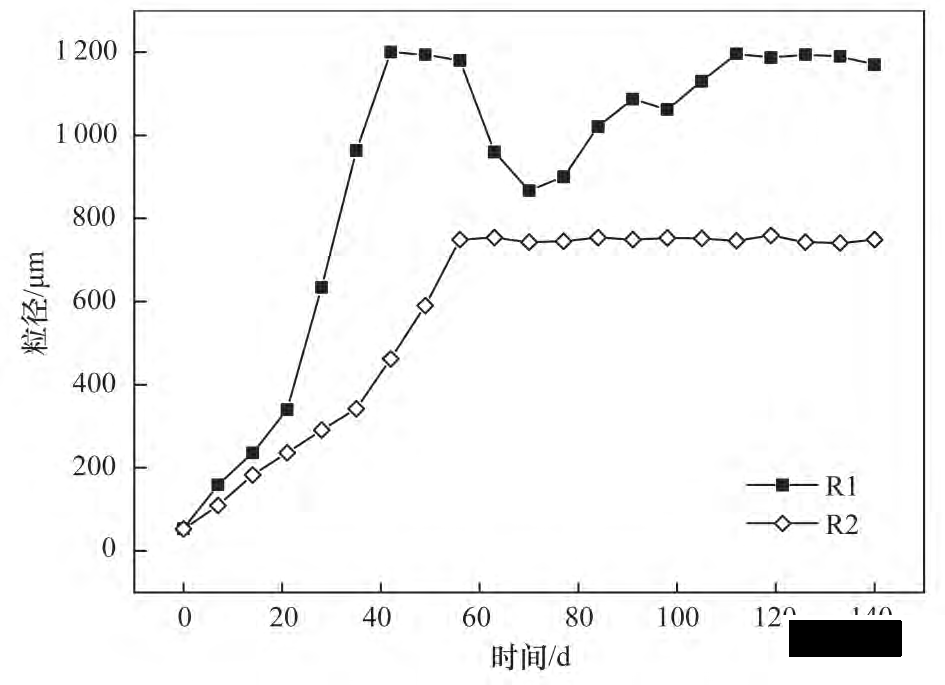 R1、R2 分別以人工配水和實際生活污水為進水,接種污水處理廠普通絮狀活性污泥,采取逐漸縮短沉淀時間的方式培養好氧顆粒污泥. R1、R2分別在第 20 d、35 d 時,出現細小顆粒,如圖 2 所示,分別歷時 25 d、42 d 后,顆粒污泥的平均粒徑達到 340 μm,好氧顆粒污泥工藝啟動成功. 顆粒污泥穩定后,其平均粒徑分別達到1 200 μm、750μm. 有研究表明進水有機負荷是好氧顆粒污泥形成的重要影響因素,有機負荷較低,微生物生長速率減慢,不利于顆?;? 人工配水中的有機物易被微生物吸收利用,而實際生活污水水質成分復雜,由易生物降解物質、慢速生物降解物質和溶解性惰性物質組成,其中,溶解性惰性物質包含不可生物降解的 COD 組分,生活污水中能被微生物利用的有機負荷較人工配水少,故 R2 相對R1 污