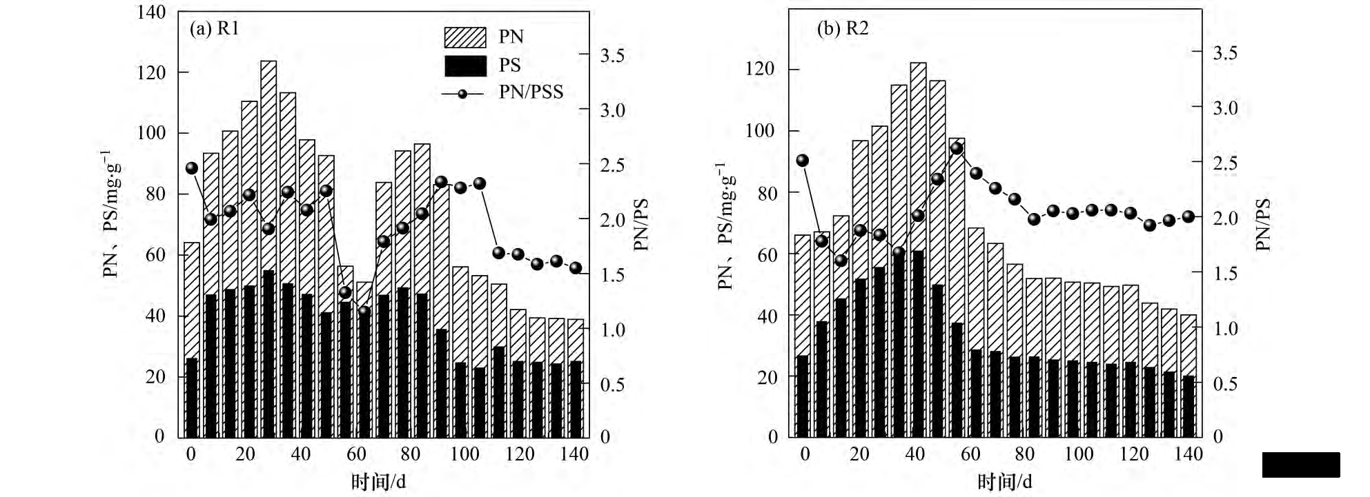 胞外聚合物( EPS) 主要由蛋白質( PN) 和多糖 ( PS) 組成,在污泥顆?;^程中具有重要作 用. 如圖4 所示,PN、PS 在顆粒污泥啟動階段 ( 0 ~ 25 d 和 0 ~ 42 d) 整體呈上升趨勢,R1、R2 內的 PN 含量( 以 MLSS 計) 分別由初始的 64. 12mg·g - 1 、65. 98 mg·g - 1 增 加 到 最 大 值 123. 65mg·g - 1 、122. 19 mg·g - 1 ,PS 含量分別由初始的26. 08 mg·g - 1 、26. 59 mg·g - 1 增加到最大值 64. 89mg·g - 1 、62. 13 mg·g - 1 . PS 越高,污泥表面親水性越強,PN 增加,污泥疏水性增強,細菌之間的黏附性能也隨之增加,有利于顆粒污泥的形成. R1 中微生物可利用的有機負荷較高,刺激微生物產生更多的EPS,故顆粒形成時間較短. 在實驗進行的第 57 ~ 78 d,由于室內溫度較低( 5 ~ 16℃ ) ,R1 中PN 含量減少至 51. 15 mg·g - 1 ,細胞表面的疏水性減弱,不利于微生物相互黏附,顆粒解體,而生活污水中含有一定的蛋白質,與顆粒污泥接觸時可被絮凝吸附,故 R2 中PN 含量受溫度影響較小.