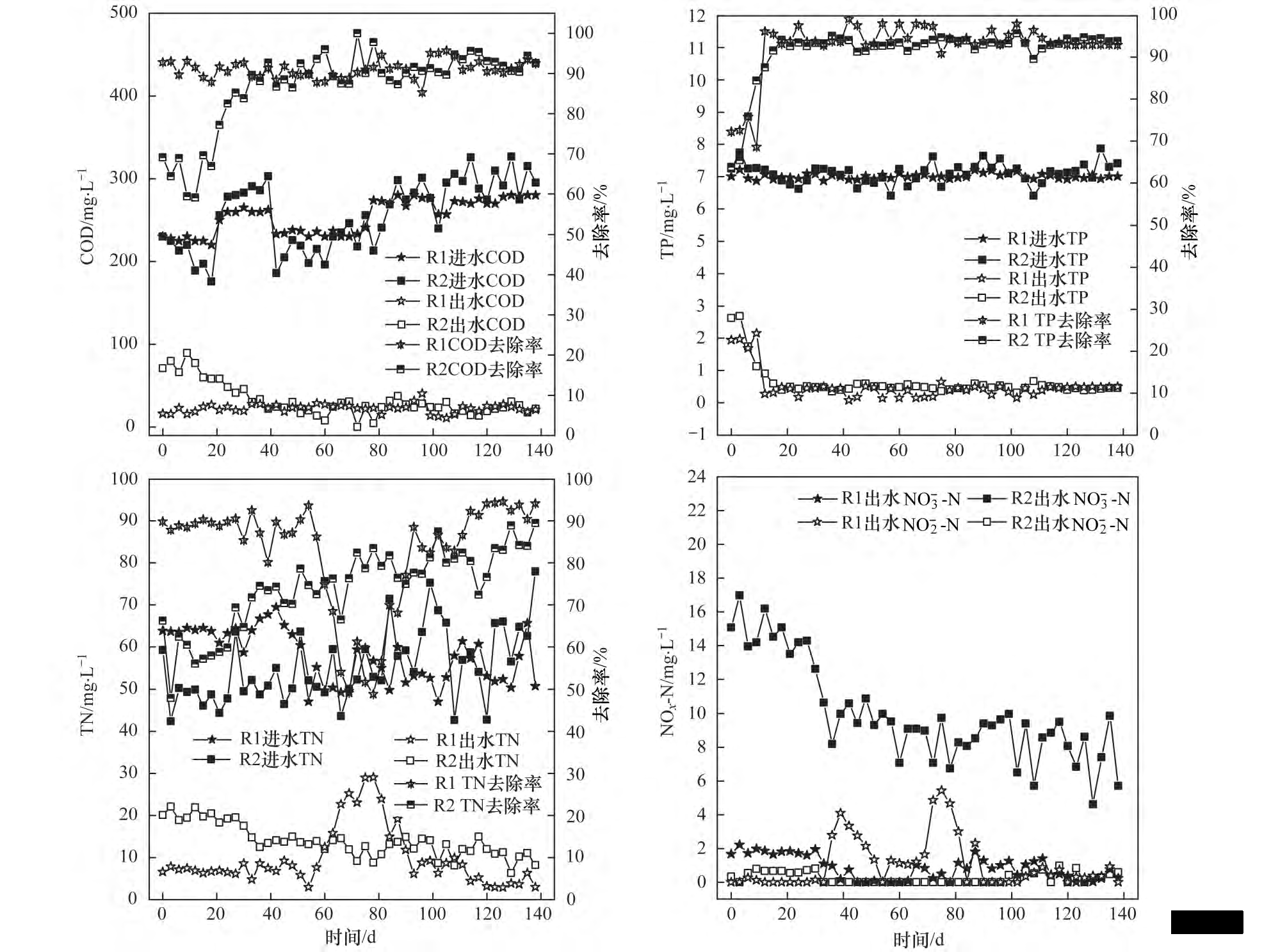 如圖 5 所示,R1 反應器在整個運行階段進水負荷較穩定,有機物能夠有效被微生物降解和吸收,COD 能夠得到有效去除,出水 COD 濃度均在 50 mg·L - 1 以下,COD 去除率達到 90% 以上. R2 反
