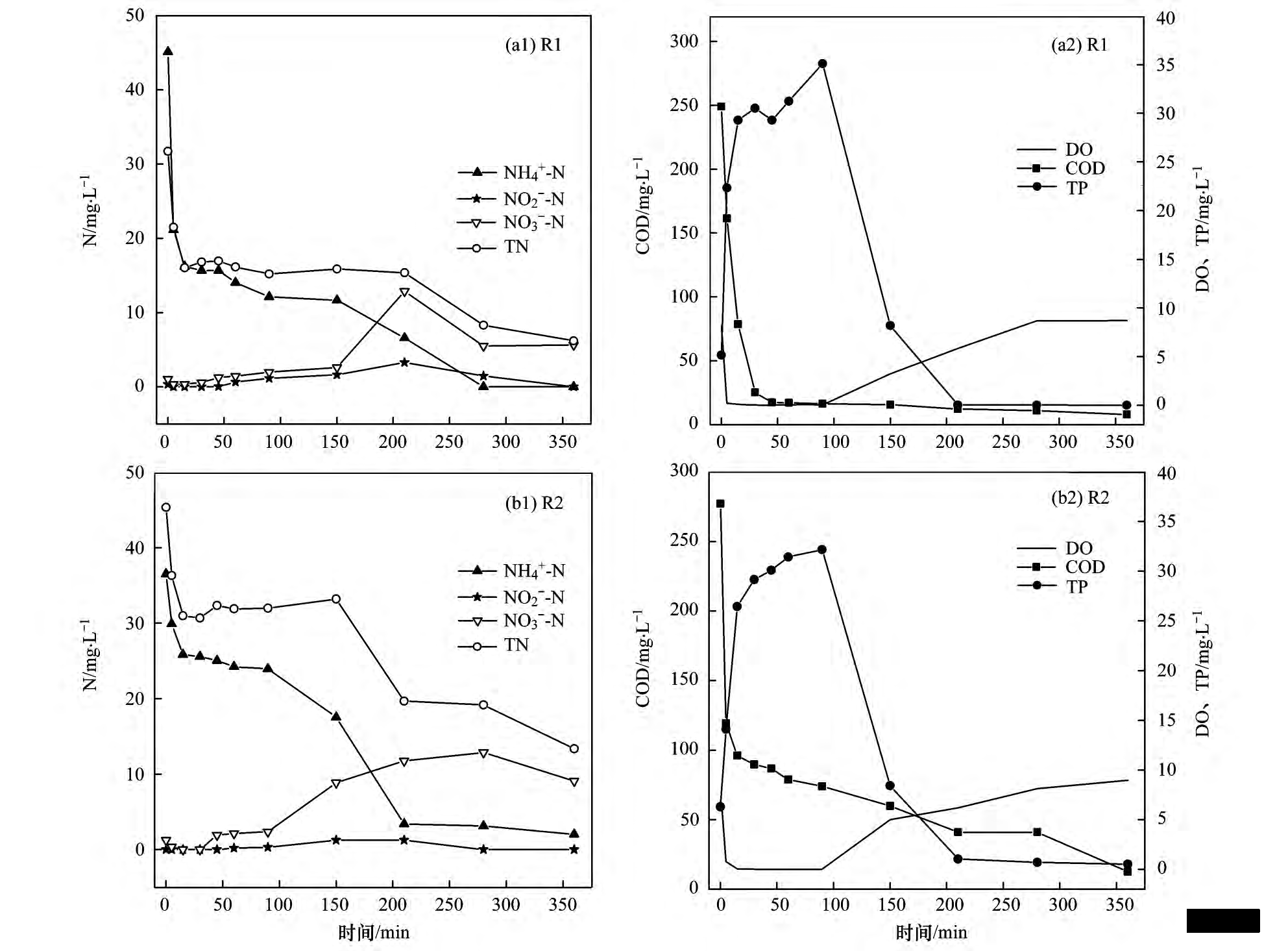 圖 6 為 R1、R2 在第 128 d 的一個典型周期內NH + -N、NO - -N、NO - -N、TN、COD、TP、溶解氧4 2 3( DO) 的濃度變化. 厭氧階段,R1、R2 反應器內的DO 濃度在 0. 02 mg·L - 1 以下,好氧階段,R1、R2中 DO 緩慢增加,最終穩定在 8 mg·L - 1 左右,反應器內具有良好的 A/ O 運行環境. R1 中 COD 濃度在厭氧階段下降較快,在前 30 min 已經基本消耗,COD 由 250 mg·L - 1 降至 25. 12 mg·L - 1 . R2 反應器進水為生活污水,在厭氧階段,由于有機物成分復雜,微生物可快速利用的有機碳源較少,所以降解速度較慢, COD 由 275. 19 mg·L - 1 降至 90. 44mg·L - 1 ; 在好氧階段,反硝化作用消耗有機碳源,COD 濃度逐漸降低至 24. 58 mg·L - 1 ,COD 得到去除. 在厭氧末期,R1 釋磷較多,反應器內的 TP 濃度為 35. 09 mg·L - 1 ,而 R2 反應器內的 TP 濃度為32. 18 mg·L - 1 . 導致釋磷量不同的主要原因為生活污水中含有慢速生物降解物質和溶解性惰性物質等不利于聚磷菌利用的有機物,在厭氧階段不能夠完全降解,降低了釋磷量. 在周期實驗出水中,R1、R2 出水均未檢測到NH + -N、NO - -N,出水NO - -N濃度分別為 5. 65 mg·L - 1 、9. 67 mg·L - 1 ,產生這種現象的原因為,穩定運行時,R1 中顆粒污泥粒徑較R2 大,由于好氧顆粒污泥內部存在一個“缺氧區”,粒徑越大,顆粒污泥內部的缺氧區越大,這為反硝化菌提供了良好的生存環境,提高了反硝化能力,因此 R1 反應器內NO - -N的出水效果更好.