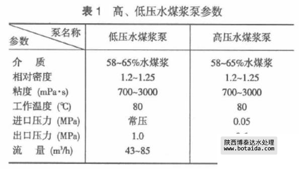 從制槳到氣化,裝置中比較關鍵的泵是高、低壓煤漿泵。表1為德士古工藝高、低壓水煤漿泵主要技術參數。