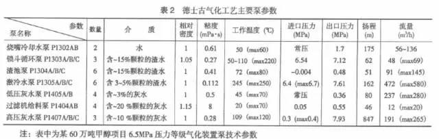 水煤(料)漿氣化和灰水處理裝置主要用泵,包括:高壓煤(料)漿給料泵、燒嘴冷卻水泵、激冷水泵或黑水循環泵、鎖渣罐循環泵、渣池泵、預熱水泵、澄清槽給料泵、除氧水泵(或碳洗塔給料泵)、真空泵(系統)、真空凝液泵、絮凝劑泵、分散劑泵、低壓灰水泵、澄清槽進料泵、澄清槽底泵、過濾機進料泵、地面沖洗液下泵、真空過濾機真空泵、濾液泵等;