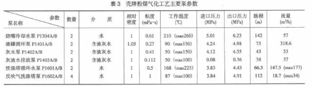 表3為某油改煤項目Shell粉煤氣化工藝主要泵技術參數。燒嘴冷卻水泵、渣池循環泵、灰水泵、灰渣水排放泵等在氣化裝置中屬于重點泵設備。同水煤漿氣化裝置類似,這些泵工作的環境都很劣。進口壓力高、溫度高、輸送的介質中含有煤灰固體顆粒,或者幾項情況同時存在。從目前裝置上設備使用情況看,所需泵都能在國內解決,只是使用壽命長短問題。雙相鋼材料、特殊軸封結構的應用為這些泵的安全運行打下很好的基礎。